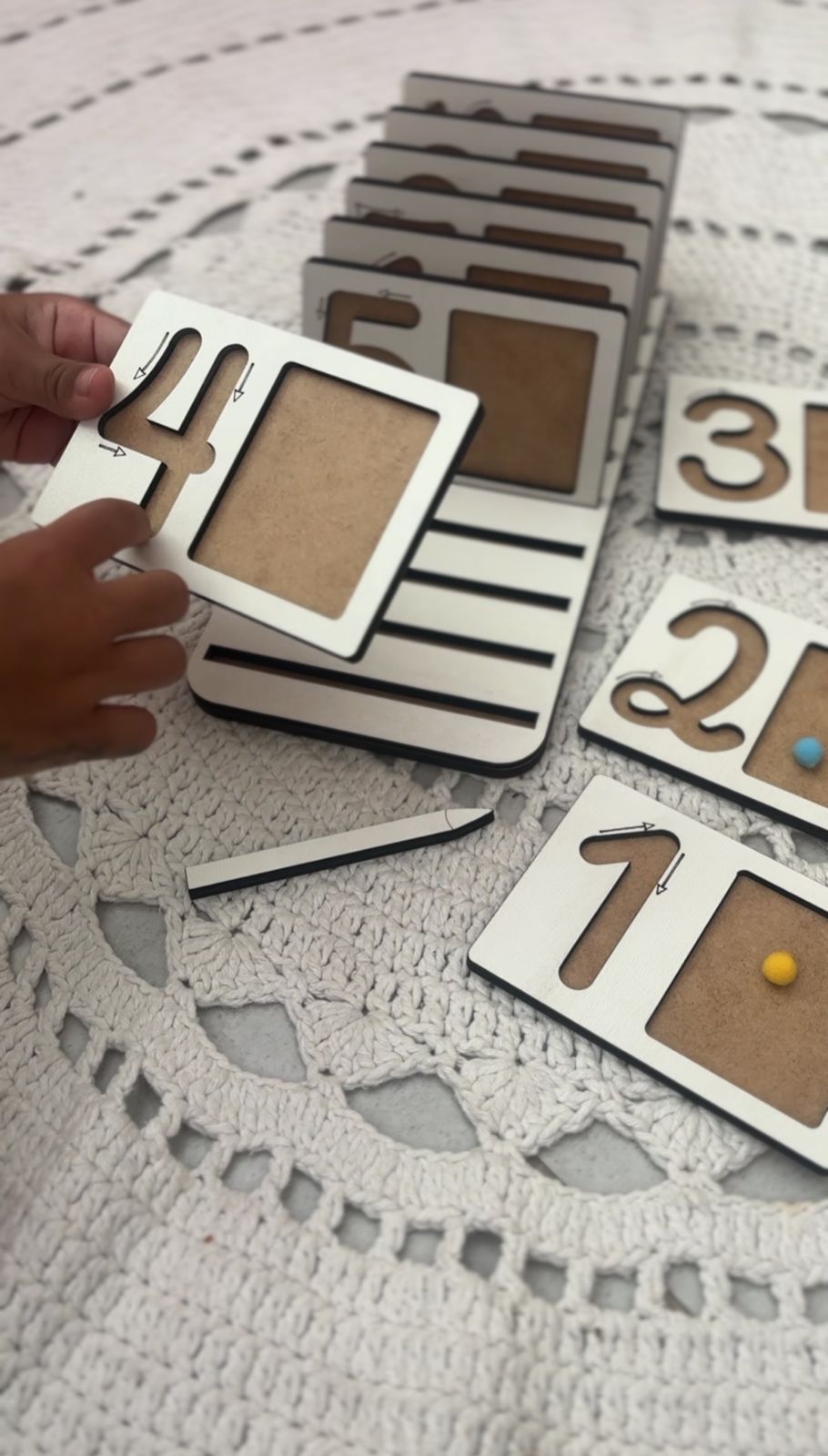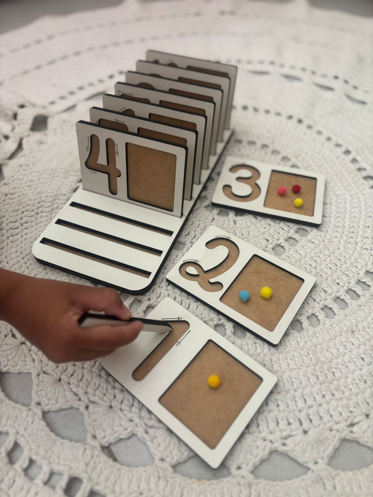 Transforme o aprendizado dos números em uma experiência sensorial e divertida! Este conjunto foi desenvolvido para auxiliar a criança na transição para a escrita cursiva e na compreensão das quantidades de forma concreta.