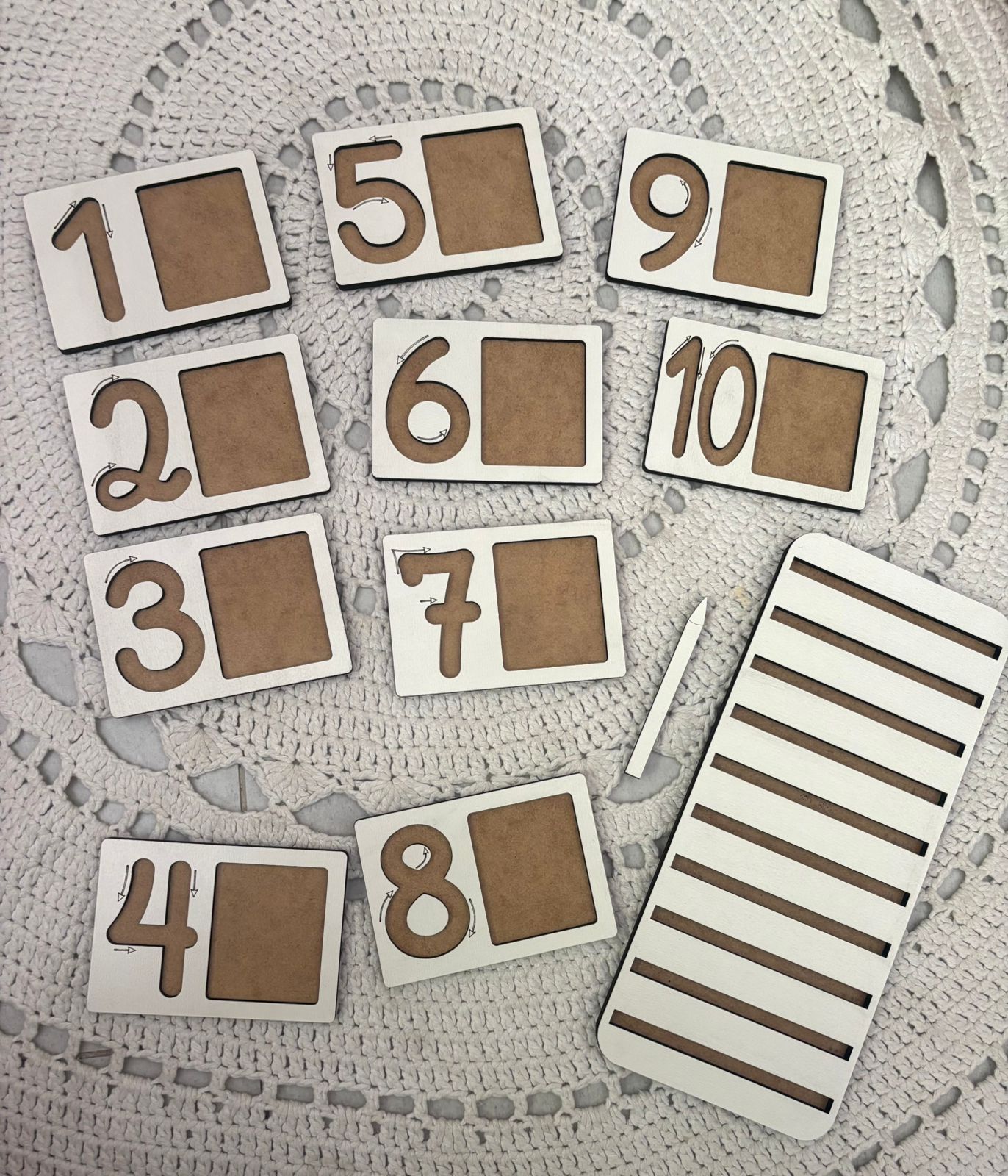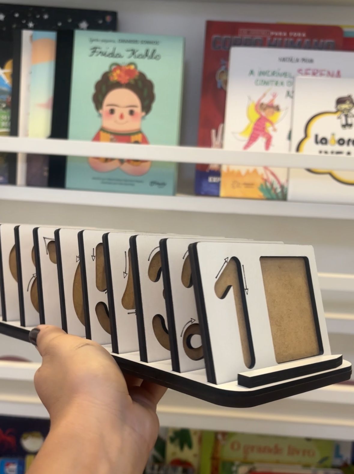 10 Bandejas Individuais (1 a 10): Com números vazados em fonte cursiva, perfeitos para o treino do traçado.