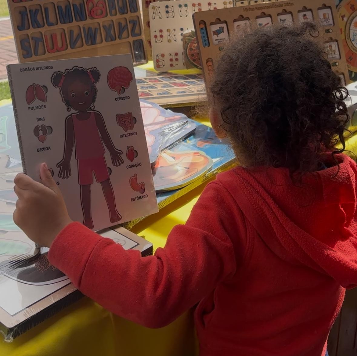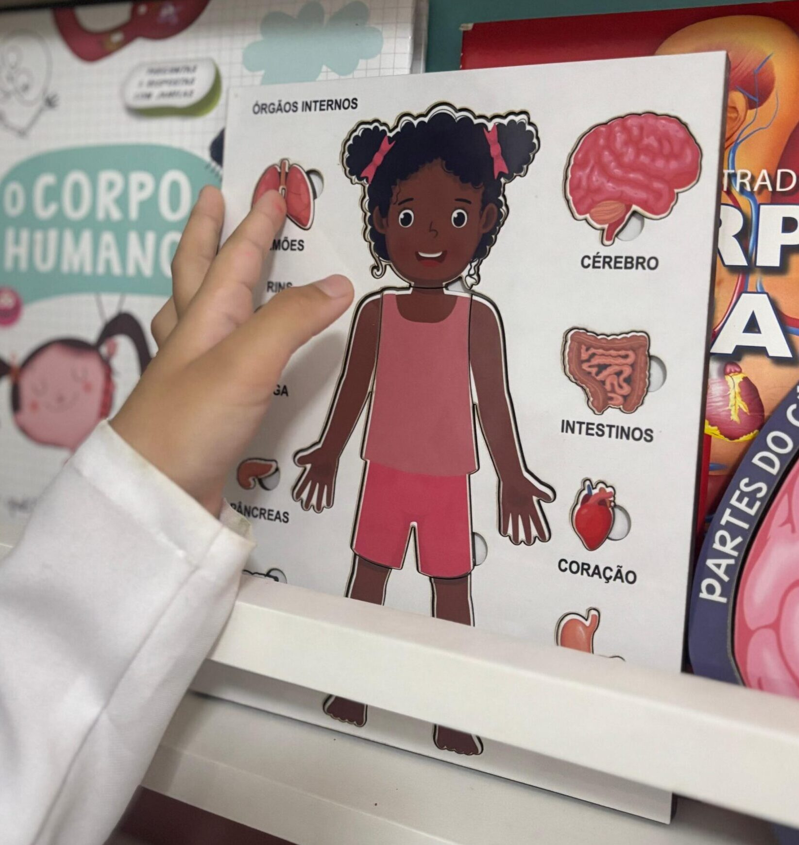 Este recurso pedagógico é composto por uma base com a ilustração de uma criança e peças destacáveis dos principais órgãos internos: pulmões, rins, cérebro, coração, fígado, pâncreas, estômago e intestinos. As crianças aprendem brincando, encaixando cada órgão no lugar certo e desenvolvendo noções iniciais de anatomia de forma visual e prática.