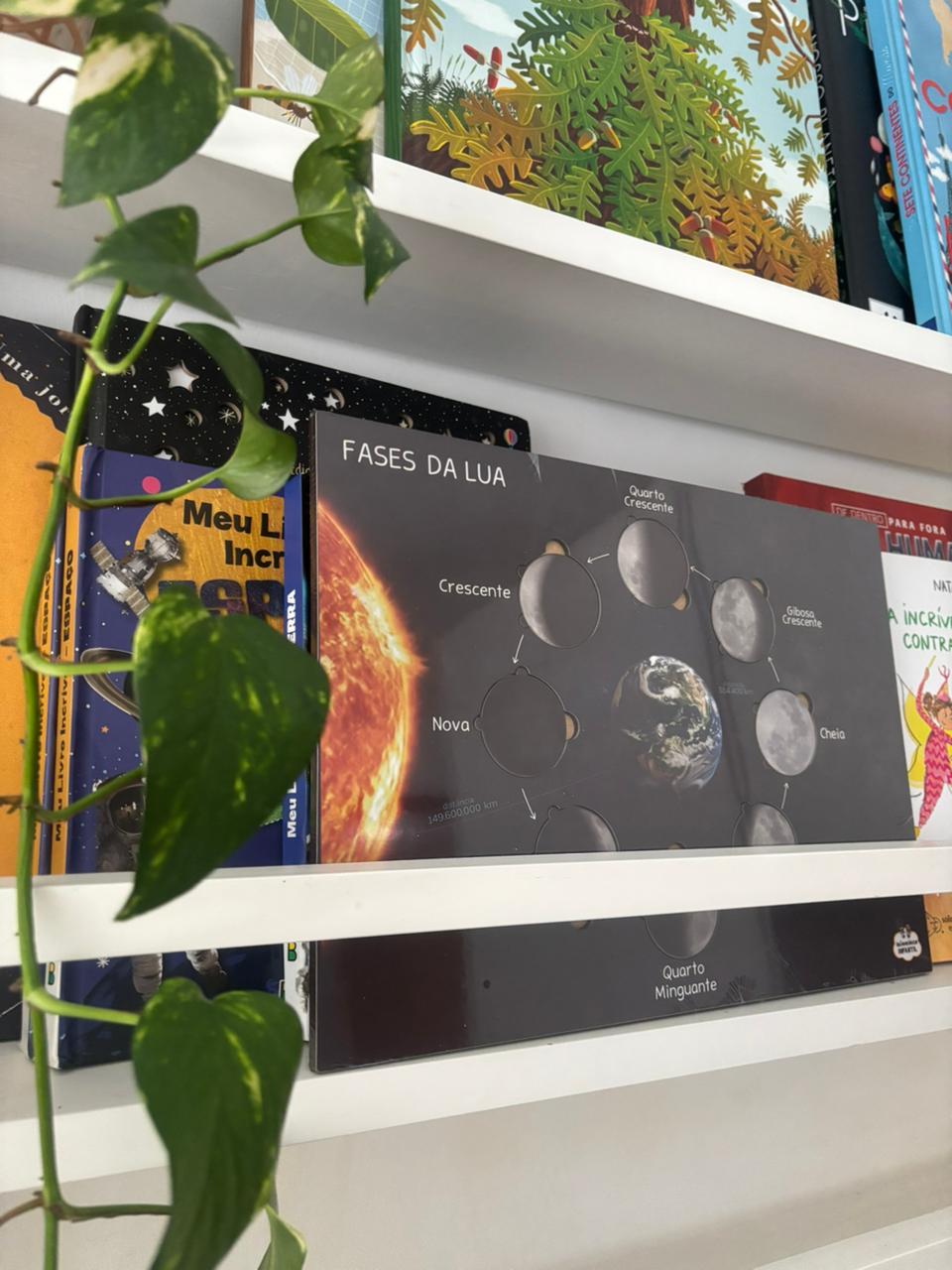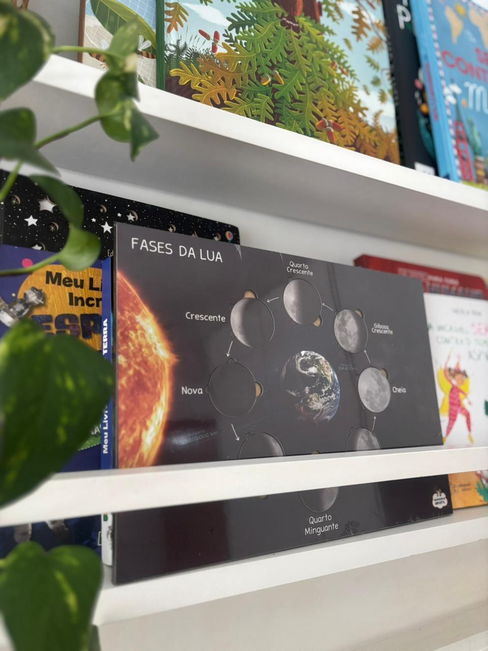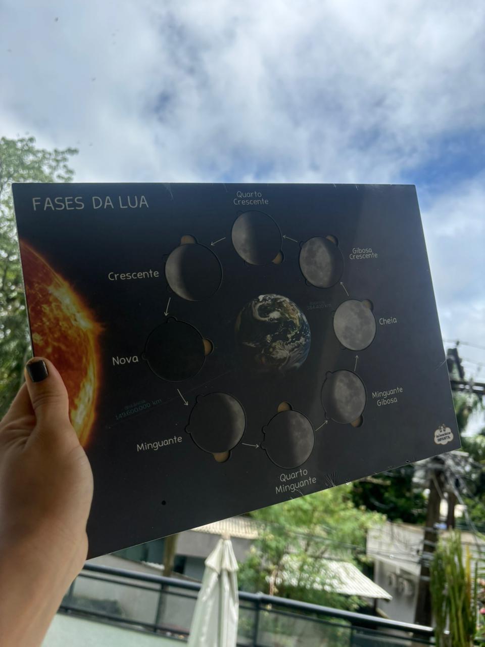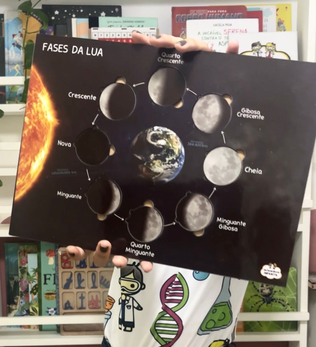 Um material educativo envolvente que ajuda a criança a compreender, de forma concreta e visual, por que a Lua muda ao longo do mês. Com imagens realistas e encaixes intuitivos, o material representa a posição da Lua em relação à Terra e ao Sol, facilitando o entendimento das fases lunares e do movimento dos astros.