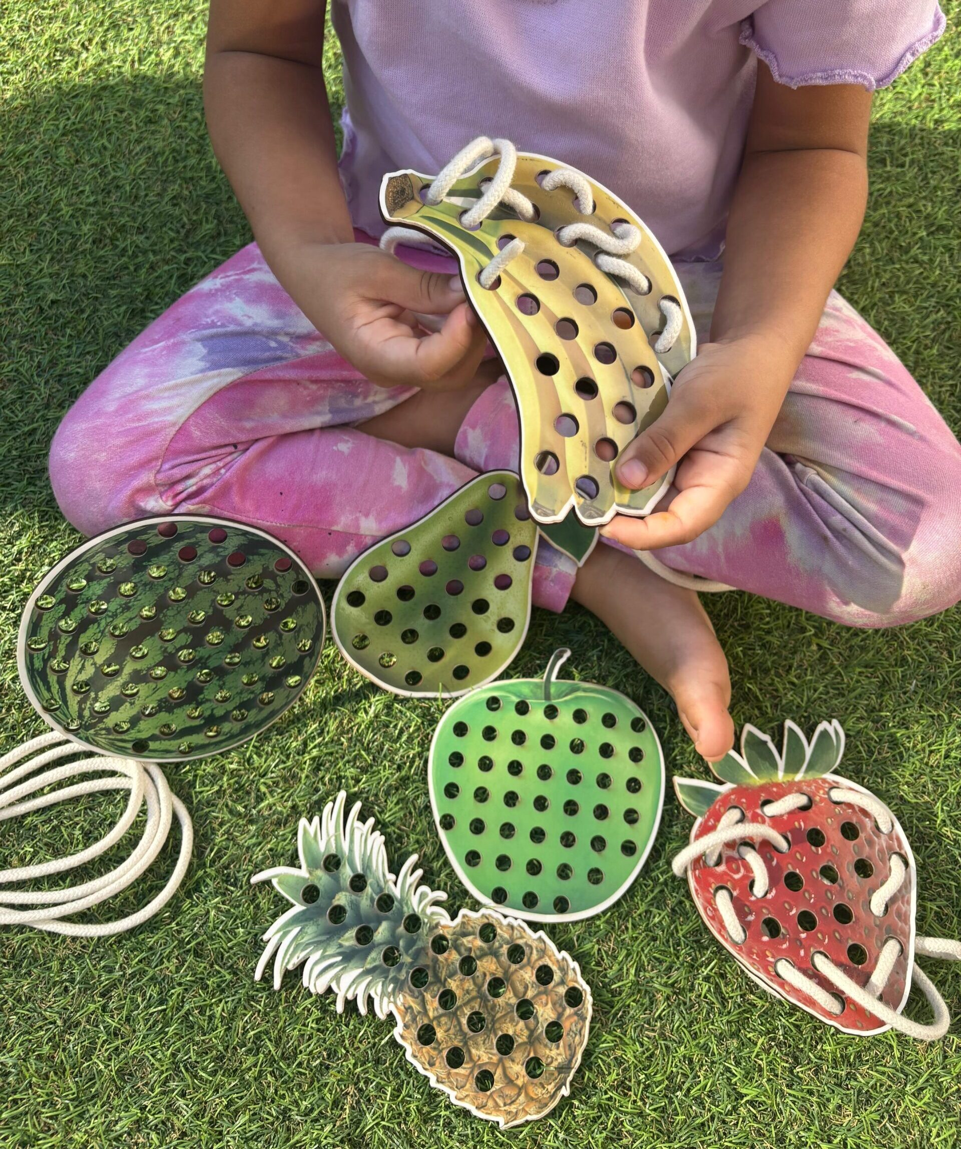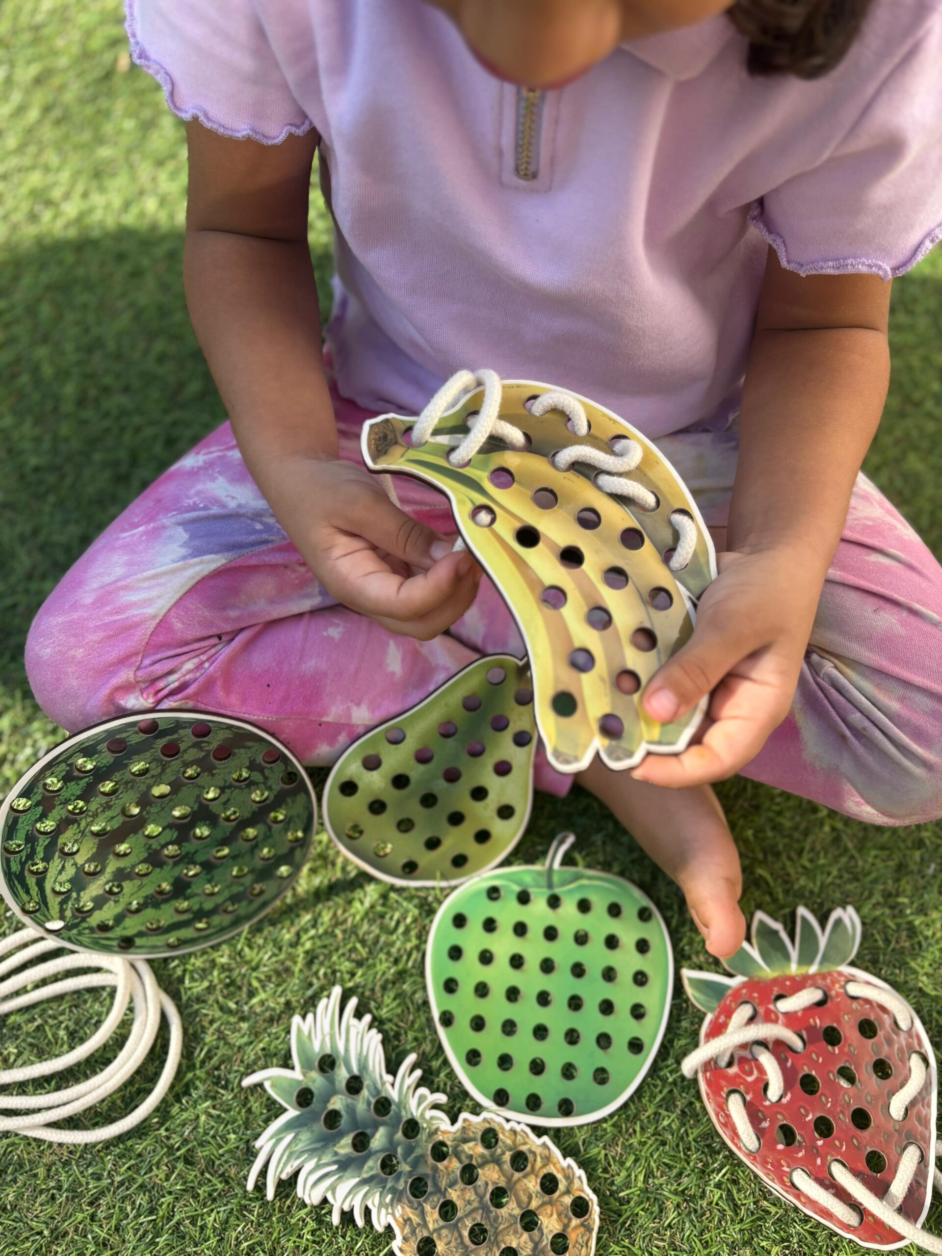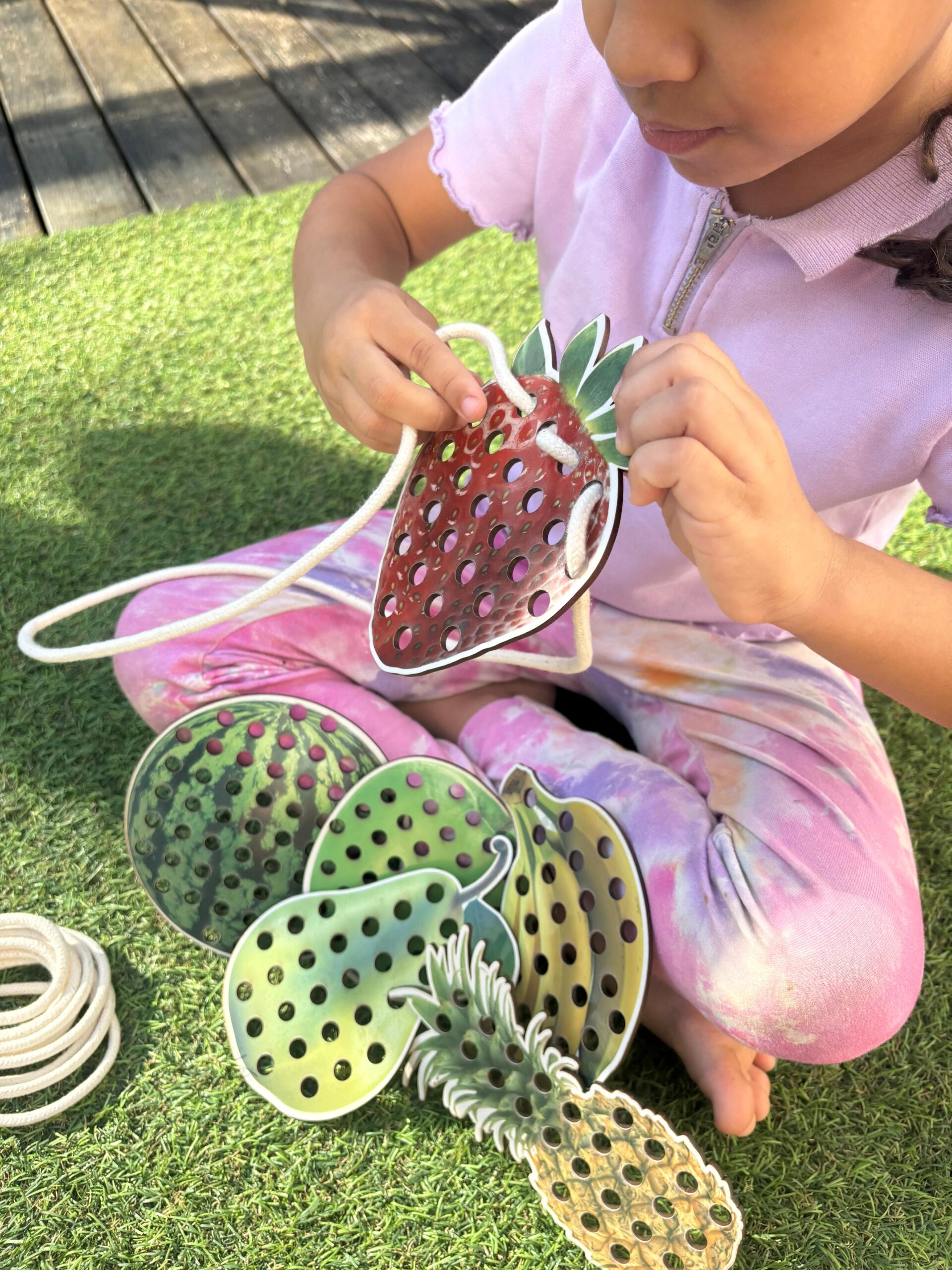 Cada fruta possui aproximadamente 15 cm e é feita em MDF resistente, com ilustrações realistas que encantam e despertam o interesse dos pequenos. Os furos permitem o alinhavo com os cadarços, promovendo o exercício de movimentos precisos, essenciais para o processo de pré-escrita.