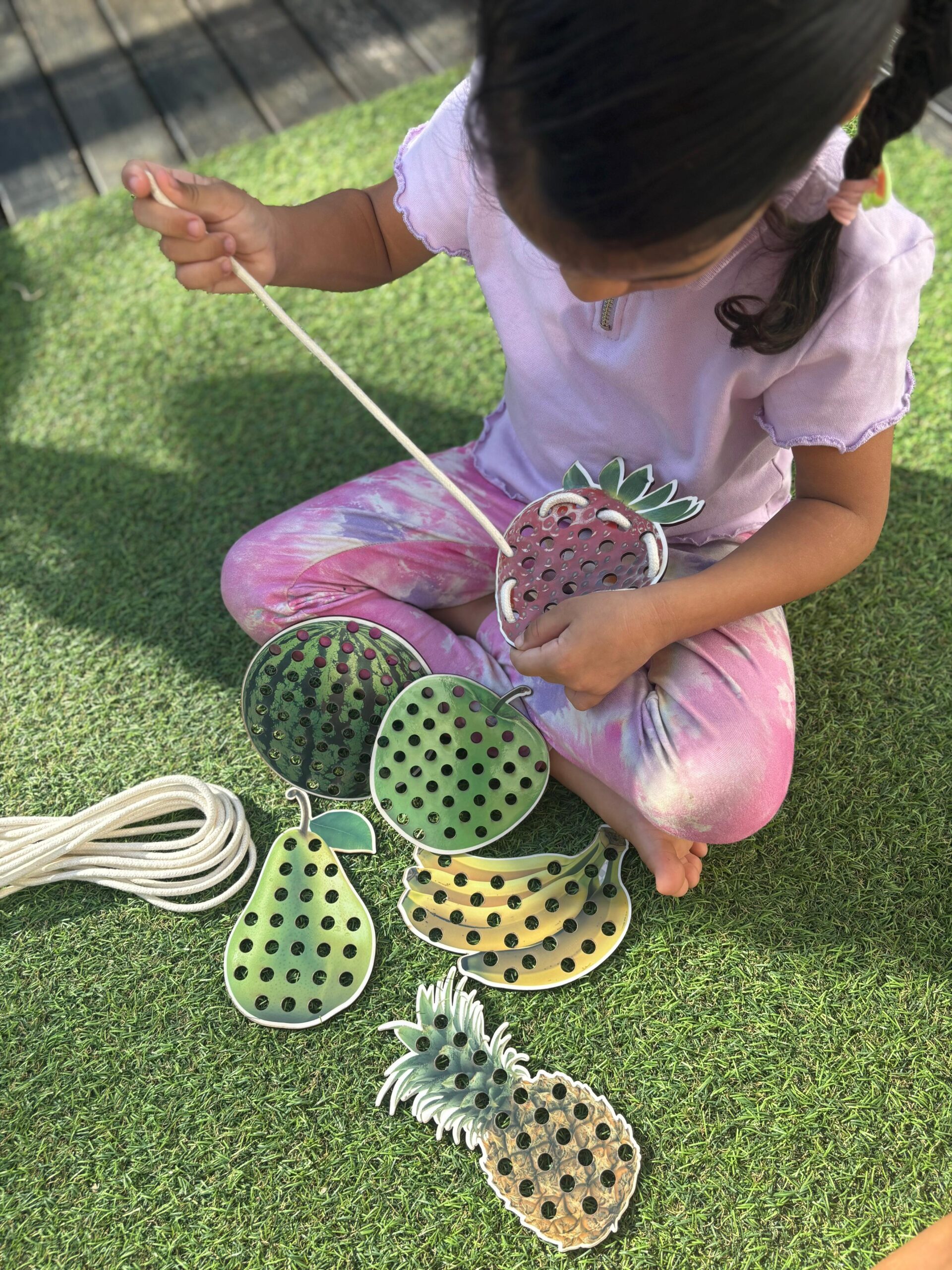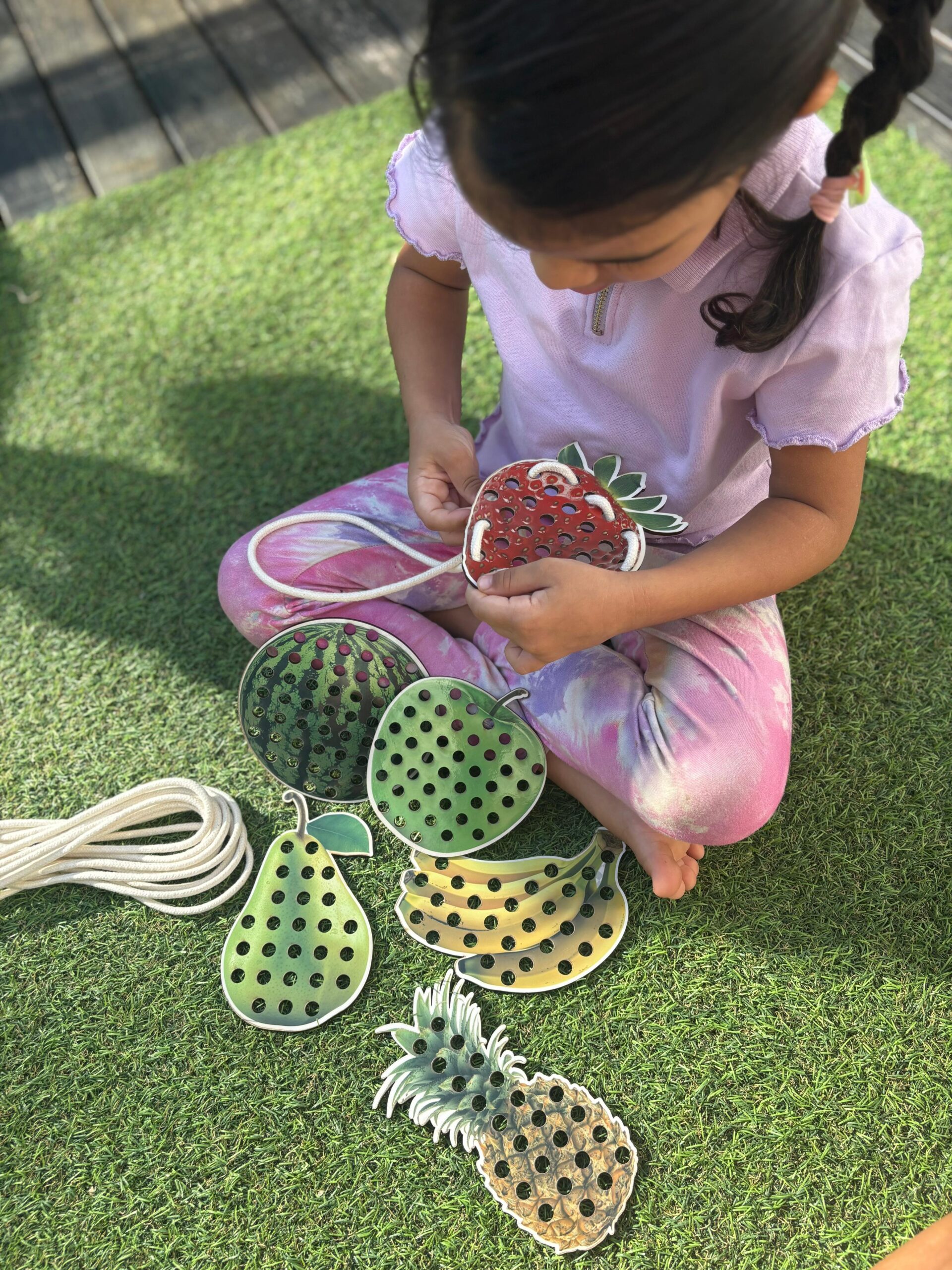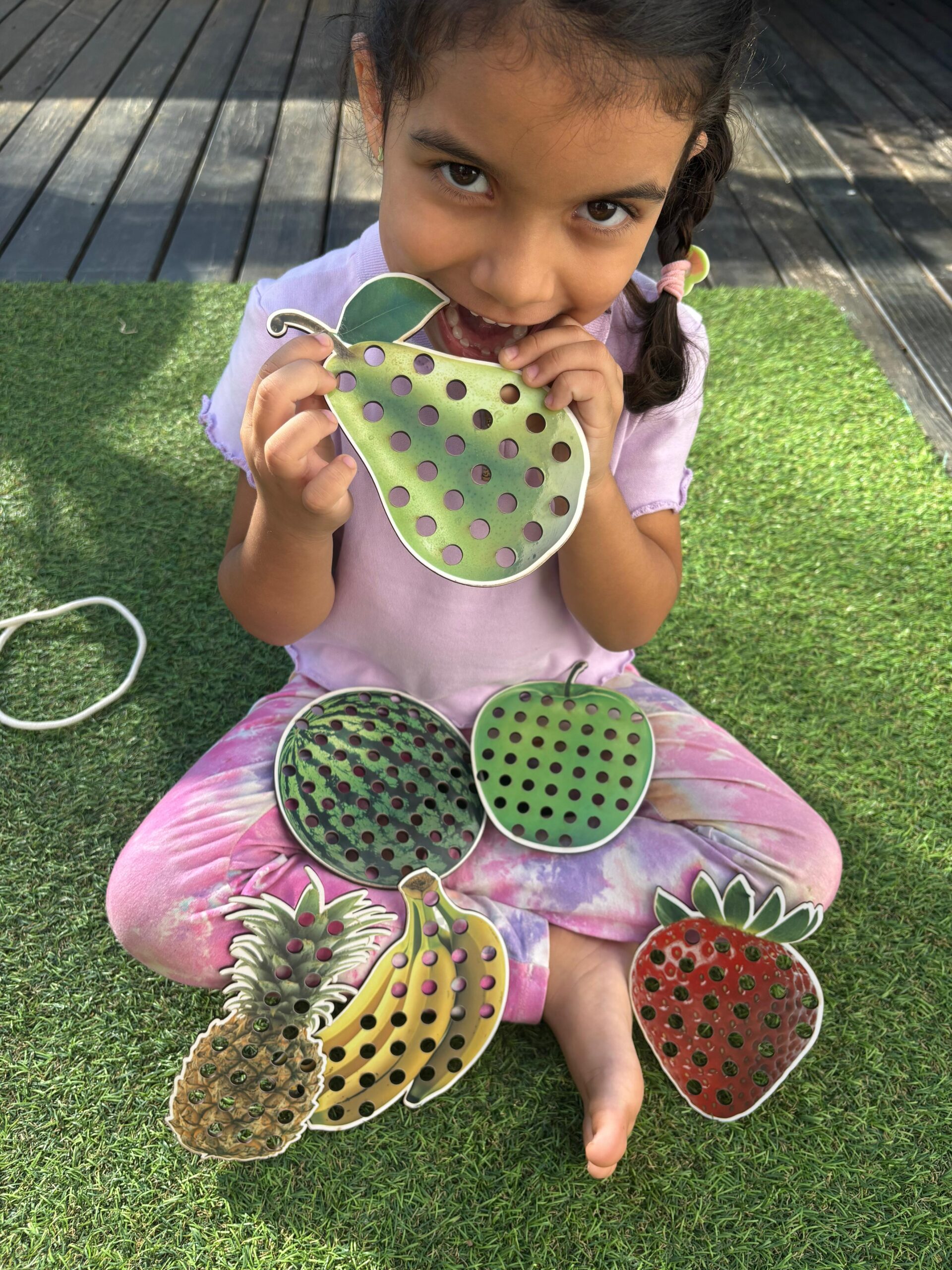 Cada fruta possui aproximadamente 15 cm e é feita em MDF resistente, com ilustrações realistas que encantam e despertam o interesse dos pequenos. Os furos permitem o alinhavo com os cadarços, promovendo o exercício de movimentos precisos, essenciais para o processo de pré-escrita.
